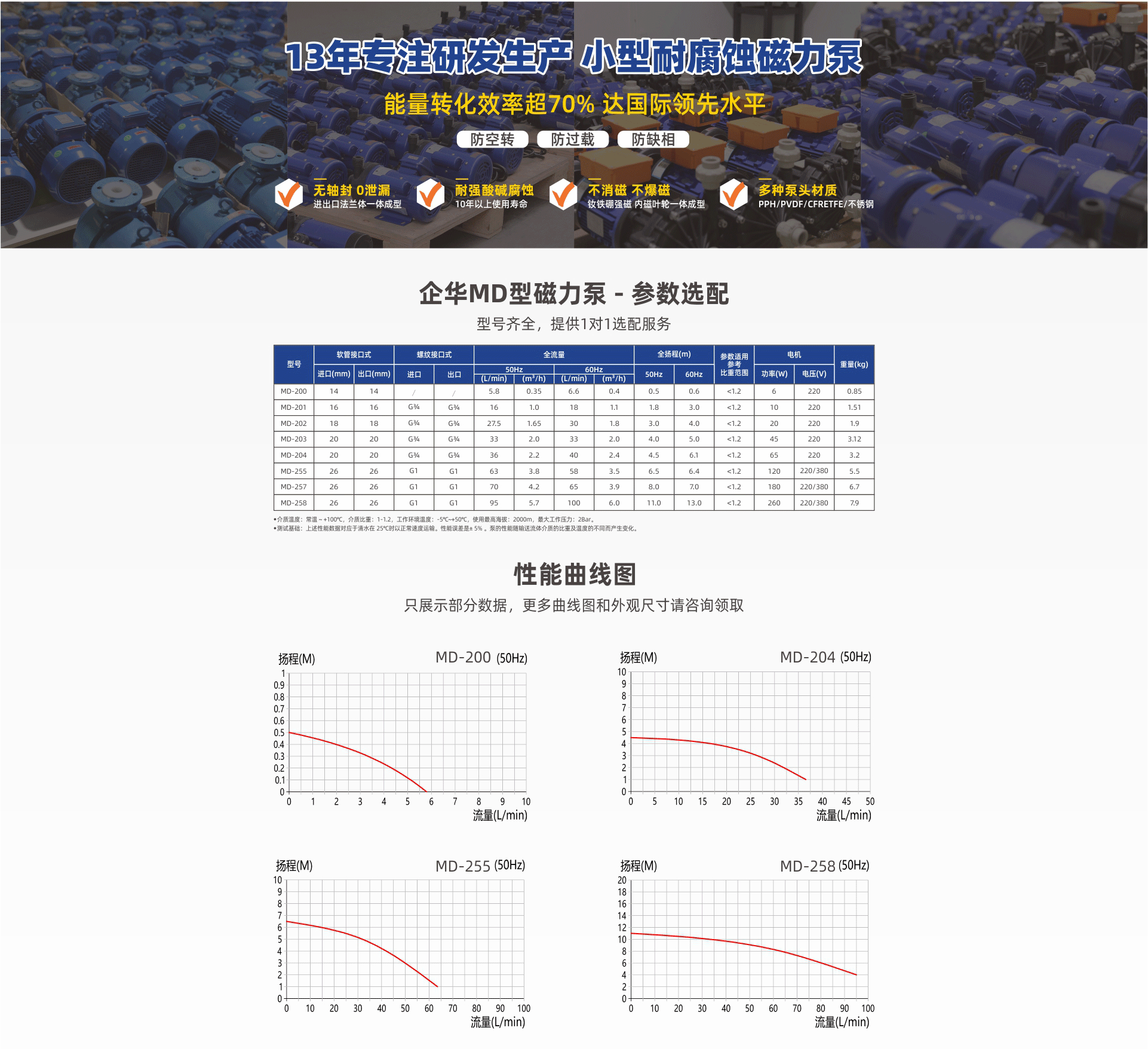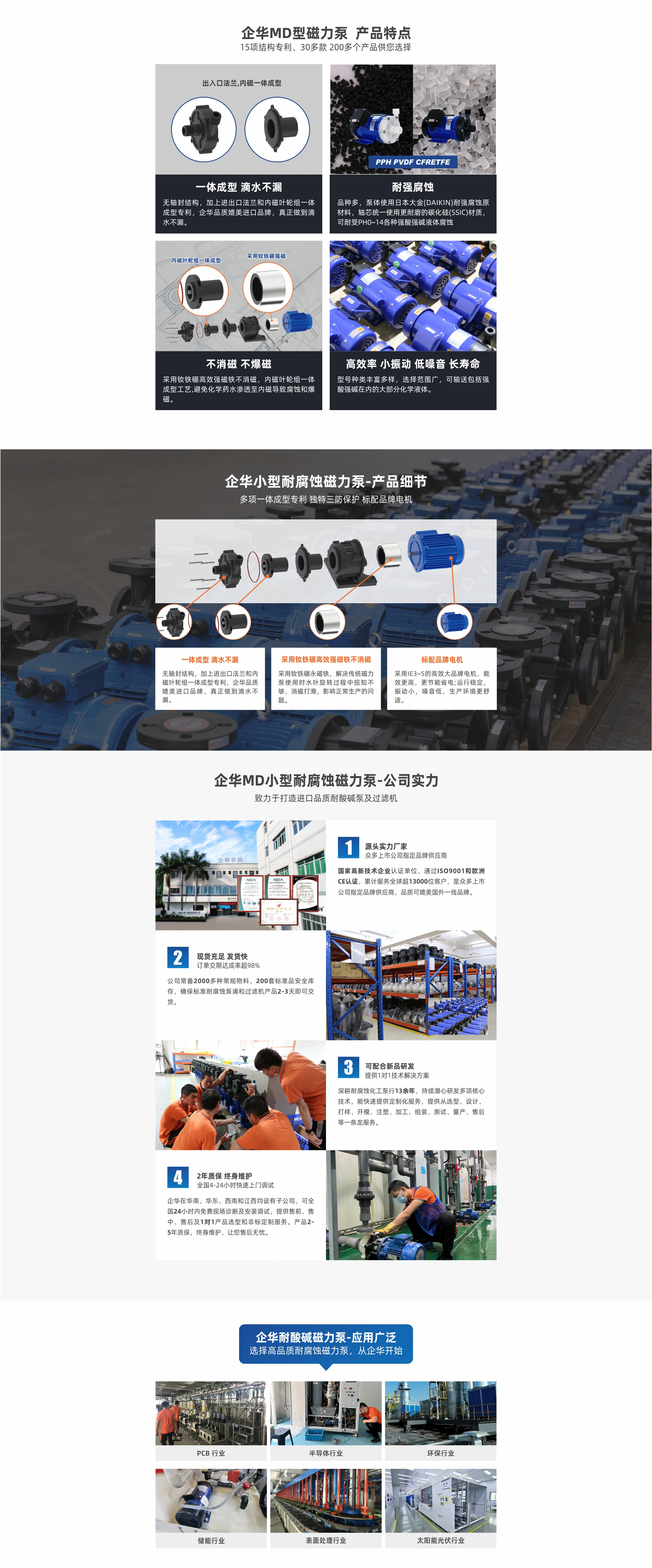 耐強(qiáng)腐蝕,進(jìn)出口法蘭一體成型專利滴水不漏;采用釹鐵硼高效強(qiáng)磁不消磁,內(nèi)磁葉輪一體成型不爆磁;多種泵頭材質(zhì)、體積小、振動(dòng)小、噪音低、壽命長(zhǎng)。